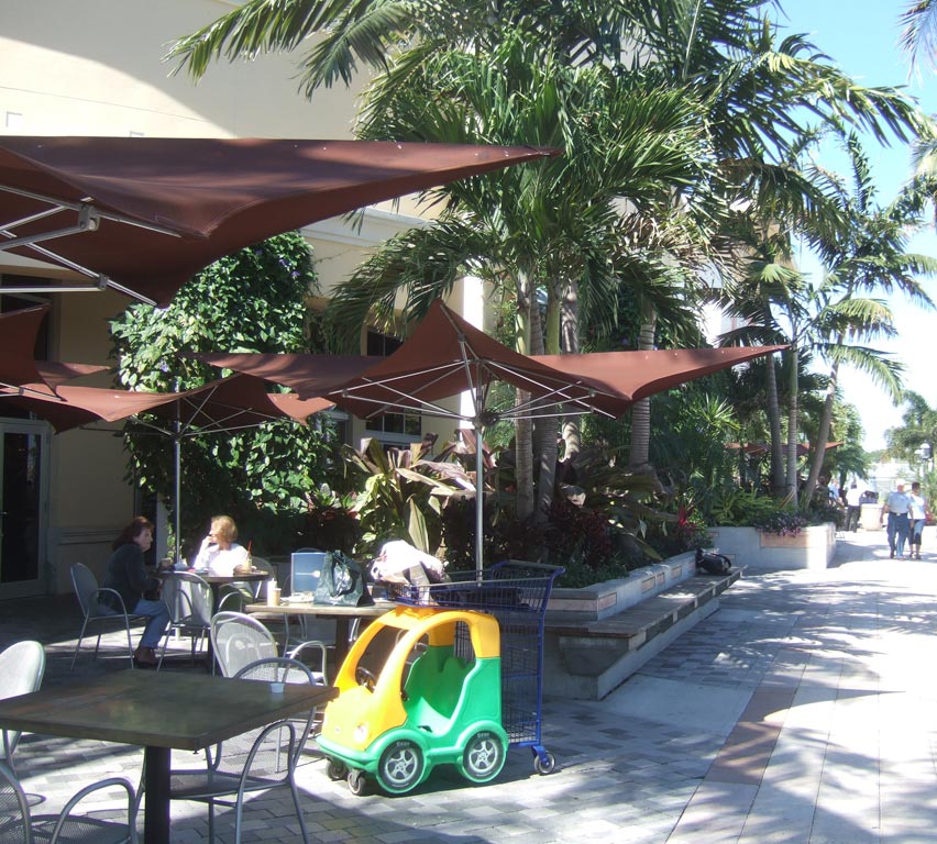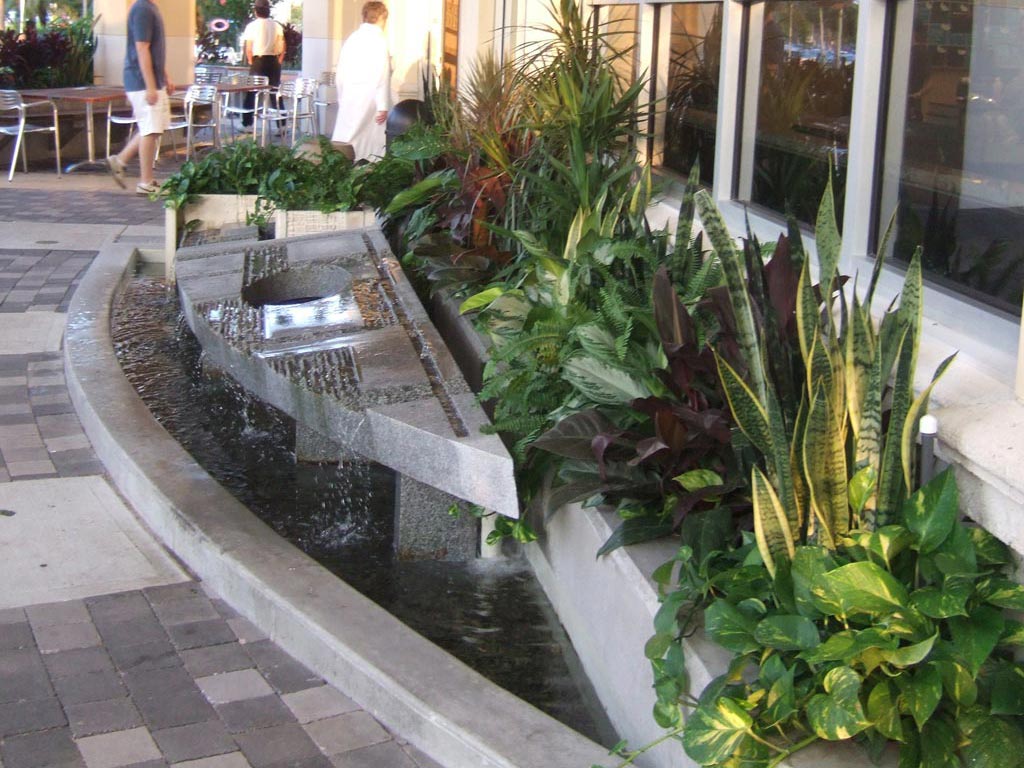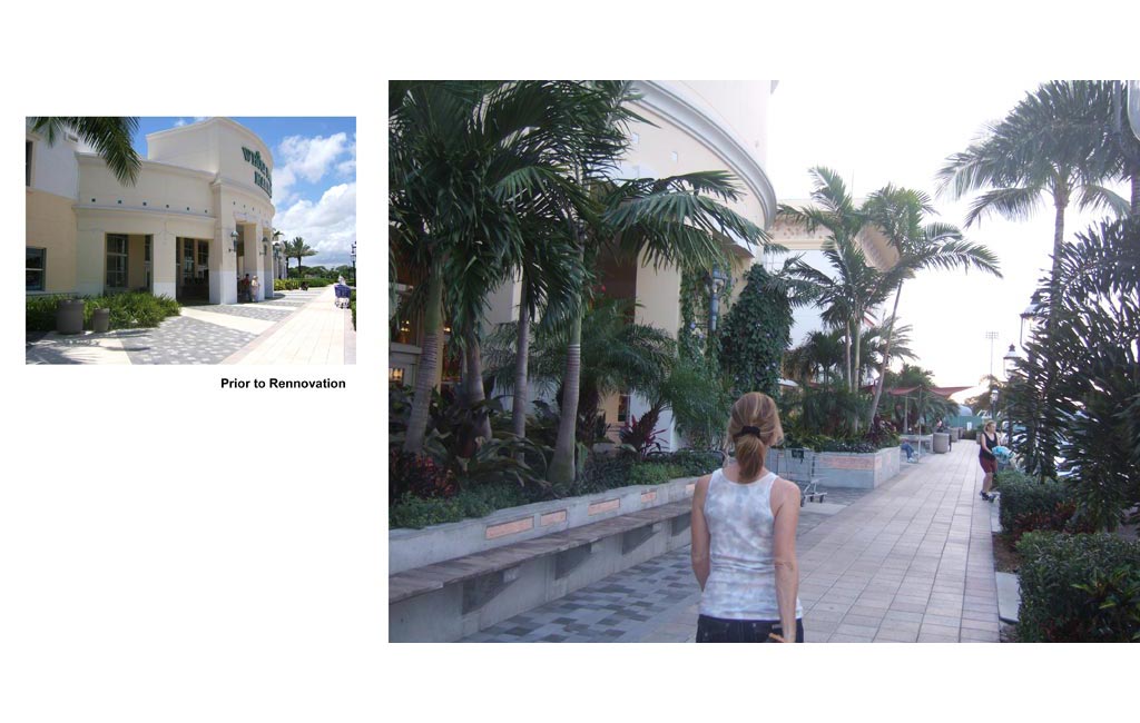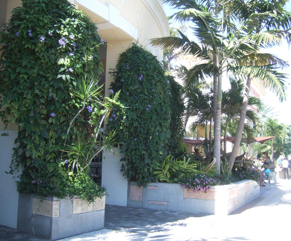 When Whole Foods Market expanded its Boca Raton Market they engaged Michael Singer Studio to design the building’s new exterior spaces including the outdoor café courtyard gardens and plant market. A small sculptural water element was integrated into the covered entry space with a semi-circular form following the shape of the existing rotunda. The water element is comprised of a large curving granite slab and planters with tropical vegetation. The water element surface is composed of split faced granite channels that guide water flow from its source below the slab to the curved edge and into a shallow pool below. Raised concrete planters with sculpted textured panels and integrated reclaimed wood seats define a series of discreet gathering spaces around the café gardens. Dense native and tropical vegetation fill the raised planters and adjacent at-grade beds to enclose the spaces. Additional shade is provided with umbrellas and shade canopies. The plant display area is a series of cast-in-place concrete pedestals with reclaimed wood tops and a large covered display area topped with flowering vines. Much of the paving and trees that existed prior to the renovation were protected and re-used for the project.